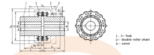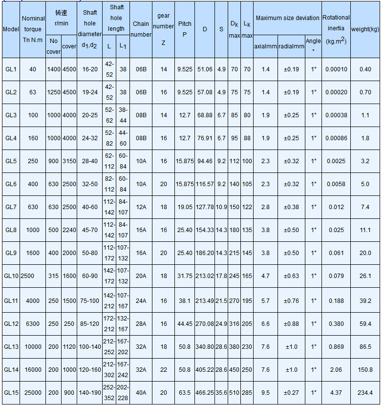 GL type roller chain coupling Features and applications: It has a small capacity to compensate the relative offset of the two axes. It has a simple structure, convenient assembly and disassembly, compact size, light weight, reliable operation and long service life. It can be used in humid, dusty, high temperature and corrosion resistant environments. Not suitable for high speed and severe impact loads and torsional conditions. It is not suitable for working parts with frequent starting and reverse rotation.
