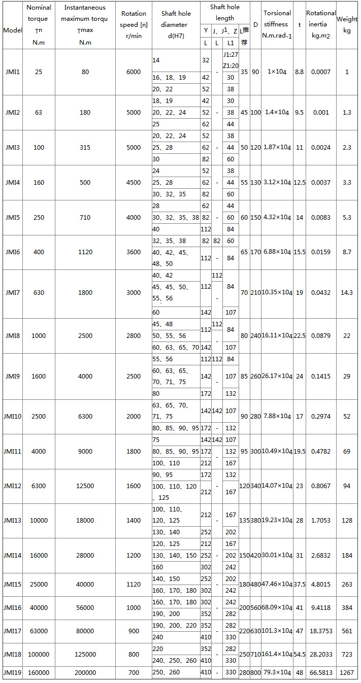 Features and application of JMI diaphragm coupling: Compared with flexible coupling of metal elastic component, it has high mechanical strength, large bearing capacity, light weight, small size, high transmission efficiency and high transmission accuracy, and good reliability. Easy to assemble and disassemble. Suitable for medium, high speed and large torque shaft drive. Compared with the drum-shaped gear coupling, it has no relative sliding, no lubrication, long service life, no noise, simple structure and so on. It can partially replace the drum-shaped toothed auxiliary device. Not affected by temperature and oil. It has the characteristics of acid resistance, alkali resistance and corrosion resistance. It can be used in high temperature, low temperature and working conditions with oil, water and corrosive media. It is suitable for shafting transmission with little change in load of various mechanical devices. It is extremely versatile and has been widely used in industrialized countries. It is a high-performance flexible coupling 重點(diǎn) which is mainly promoted and applied in China. High-precision diaphragm coupling can be used for High speed conditions. Compared with the toothed coupling, the diaphragm coupling has no relative sliding, no lubrication, no sealing, no noise, no maintenance, and is convenient to manufacture. It can partially replace the gear coupling. The diaphragm coupling has been widely used in industrialized countries in the world. In practical applications, the intermediate shaft type is generally adopted to improve the offset compensation performance of the two axes. JMI type - basic type with countersink; JMIJ type--with countersunk and intermediate shaft type; JMII type - no counterbore basic type; JMIIJ type - no countersinking intermediate shaft type ![]() ![]() |