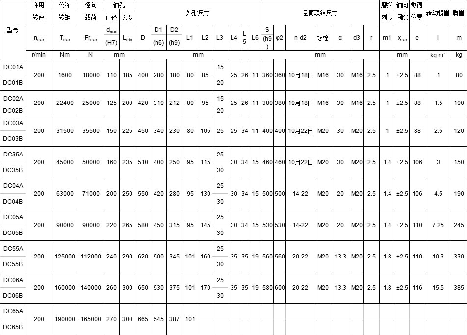 DC系列卷筒用鼓形齒式聯(lián)軸器主要參數(shù)及尺寸: mm