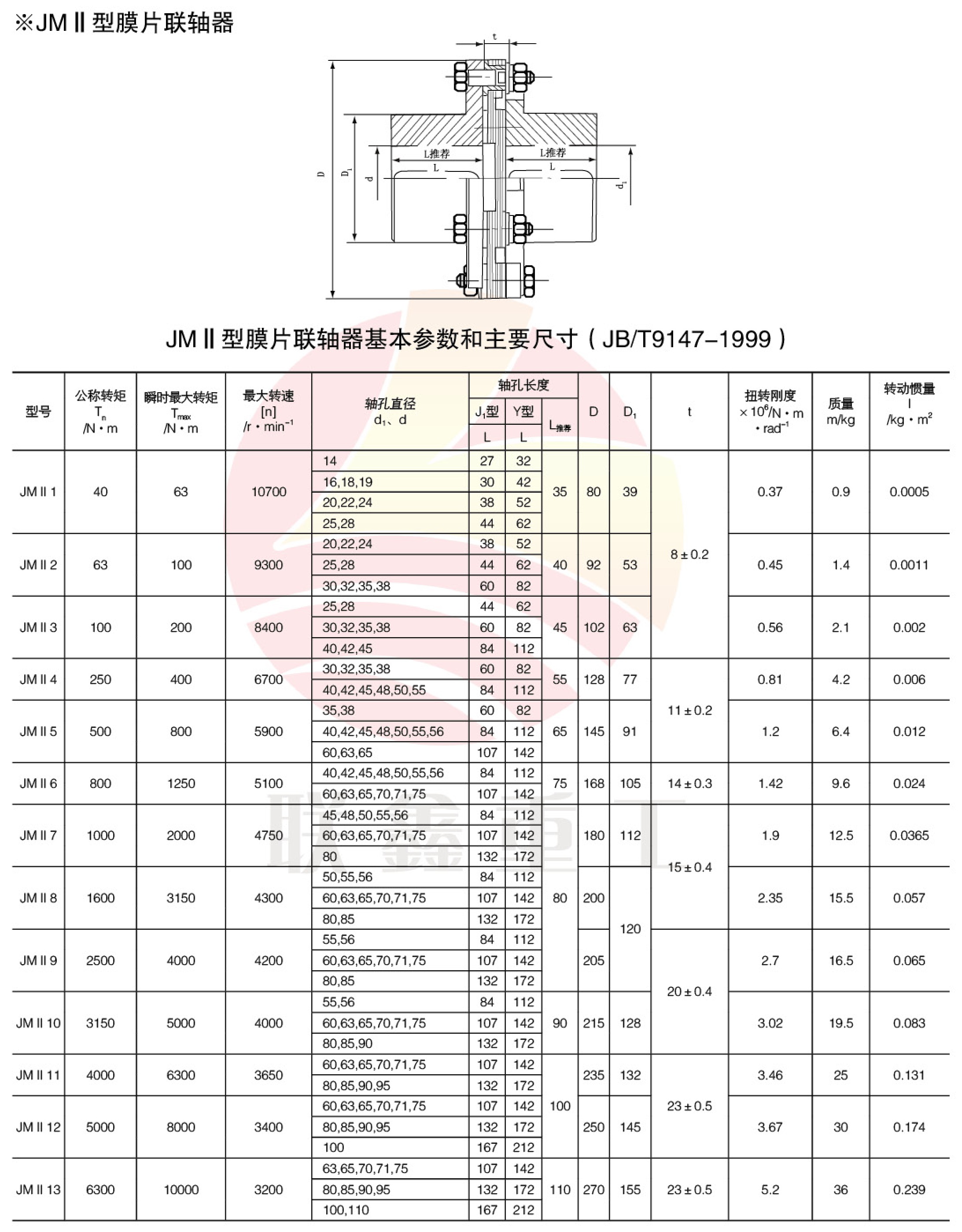 JMⅡ型膜片聯軸器 特點及應用場合:與金屬彈性元件撓性聯軸器相比,具有機械強度高,承載能力大、質量輕結構尺寸小、傳動效率和傳動精度高,可靠性好、裝拆方便等特點。適用于中、高速、大轉矩軸系傳動。與鼓形齒式聯軸器相比,具有無相對滑動,不需潤滑,使用壽命長、無噪聲、結構簡單等特點.可部分代替鼓形齒式聯輔器。不受溫度和油污影響。具有耐酸、堿,防腐蝕的特點。可用于高溫、低溫和有油、有水和腐蝕介質的工況環境.適用于各種機械裝置載荷變化不大的軸系傳動,通用性極強,工業發達國家已普遍采用,是我國重點推廣應用的高性能撓性聯軸囂,高精度膜片聯軸器可用于高速工況。膜片聯軸器與齒式聯軸器相比,沒有相對滑動,不需要潤滑、密封,無噪聲,基本不用維修,制造較方便,可部分代替齒式聯軸器。膜片聯軸器在工業發達國家應用已很普遍,在實際應用中一般采用接中間軸型,以提高兩軸線偏移補償性能。
